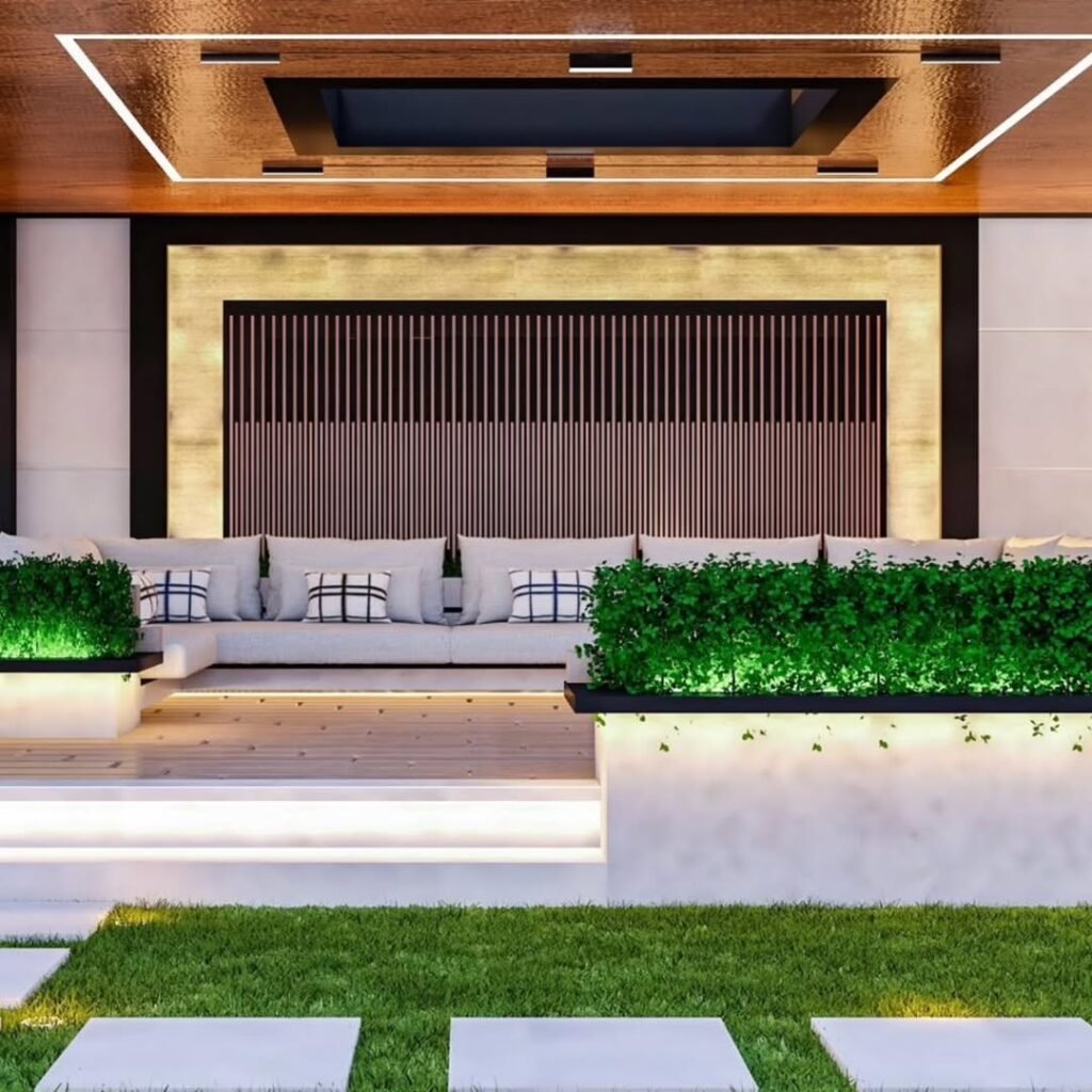 - تركيب الإضاءة الخارجية: على سبيل المثال، نضيف إضاءة أنيقة لتعزيز جمال المساحة ليلًا. اقرأ المزيد عن الإضاءة الخارجية.